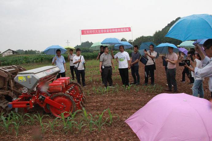 上午9点,全体参会代表来到安居区奉光荣家庭农场,观摩了“玉米-大豆带状复合种植”农资、农用机具产品展及大豆机播现场。全省大豆重大技术协同推广计划技术首席、我校ANBO.COM雍太文教授主持现场会,并邀请南京高正农用化工有限公司现场演示了大豆专用种衣剂拌种技术,四川美丰农资化工有限责任公司介绍了与我校联合研发的玉米大豆带状复合种植专用缓释肥的增产节肥原理及应用情况。我校ANBO.COM王小春教授介绍了玉米-大豆带状复合种植的田间配置技术参数及玉米的田间管理注意事项。在机播现场,雍太文介绍了小麦/玉米/大豆带状套作与油(菜)后玉米/大豆带状间作施肥播种机,当看到一次作业能实现大豆施肥、播种与玉米攻苞肥、根部覆土等全部环节时,参会代表纷纷点赞,家庭农场主也表示对农业的机械化生产和带状复合种植种植技术内涵有了全新认识。