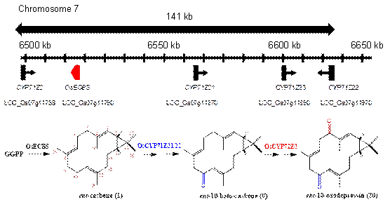 植保素是重要次生代谢产物,具有广谱抗菌性,是植物主要的化学防御机制。水稻中已经鉴定的两个植保素合成基因簇涵盖了大部分二萜植保素的生物合成基因,但casbane型二萜植保素ent-10-oxodepressin的代谢机制还未被解析。该研究成功鉴定了水稻中的第三个植保素合成基因簇c7BGC并全面解析了其在ent-10-oxodepressin生物合成的生物学功能。该研究首先成功克隆了水稻的ent-casbene合酶基因(OsECBS),利用微生物代谢工程、核磁共振波谱解析、比旋光度测定等技术手段,成功解析了OsECBS主产物ent-casbene的化学立体构型;进一步通过生物信息学分析与基因共表达分析鉴定了OsECBS与4个细胞色素P450氧化酶基因构成的c7BGC基因簇;结合微生物代谢工程和化合物结构解析阐明了c7BGC参与ent-10-oxodepressin生物合成的整个通路;同时将OsECBS在水稻中进行过表达和CRISPR/Cas9介导的基因敲除,证明了该生物合成途径参与水稻抗稻瘟病的生物学功能。该研究为水稻抗性育种和化学防御提供了重要的理论依据及调控靶点。