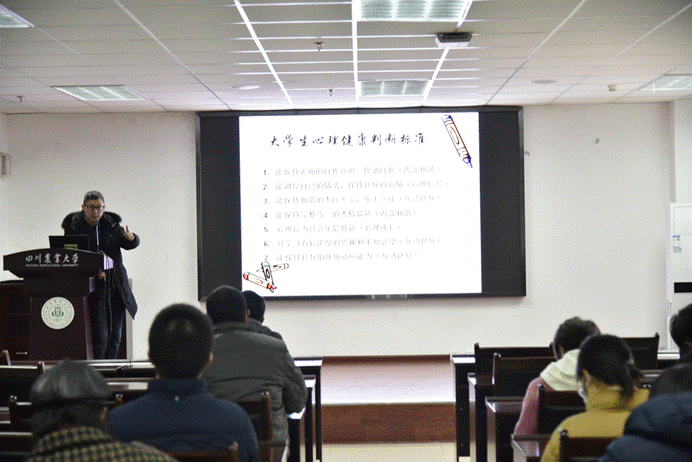欧居湖以《大学生常见心理问题的识别与处置》为题,以近期发生的学生危机事件为切入点,引出心理健康基础知识培训的重要性。通过生动的语言,从心理健康涵义及其标准、不同程度心理问题的表现、大学生心理危机的识别与处置等方面进行讲解。在危机干预环节,欧居湖重点提到教师在危机干预中的职责即发现、报告和看护,他提醒老师们在平时的工作中,要提高职业敏锐度,多关注重点人群。