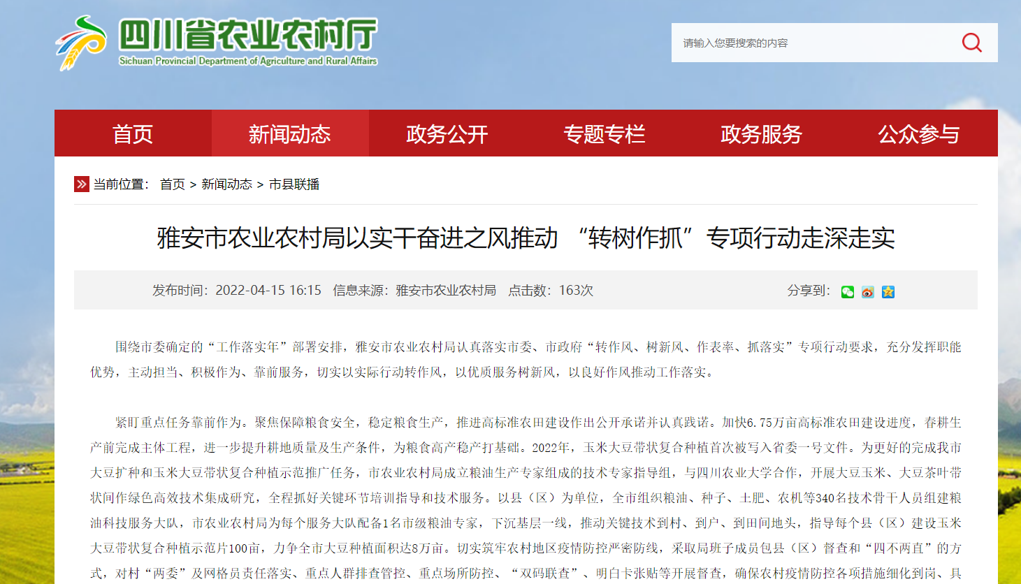 紧盯重点任务靠前作为。聚焦保障粮食安全,稳定粮食生产,推进高标准农田建设作出公开承诺并认真践诺。加快6.75万亩高标准农田建设进度,春耕生产前完成主体工程,进一步提升耕地质量及生产条件,为粮食高产稳产打基础。2022年,玉米大豆带状复合种植首次被写入省委一号文件。为更好的完成我市大豆扩种和玉米大豆带状复合种植示范推广任务,市农业农村局成立粮油生产专家组成的技术专家指导组,与四川农业大学合作,开展大豆玉米、大豆茶叶带状间作绿色高效技术集成研究,全程抓好关键环节培训指导和技术服务。以县(区)为单位,全市组织粮油、种子、土肥、农机等340名技术骨干人员组建粮油科技服务大队,市农业农村局为每个服务大队配备1名市级粮油专家,下沉基层一线,推动关键技术到村、到户、到田间地头,指导每个县(区)建设玉米大豆带状复合种植示范片100亩,力争全市大豆种植面积达8万亩。切实筑牢农村地区疫情防控严密防线,采取局班子成员包县(区)督查和“四不两直”的方式,对村“两委”及网格员责任落实、重点人群排查管控、重点场所防控、“双码联查”、明白卡张贴等开展督查,确保农村疫情防控各项措施细化到岗、具体到人。