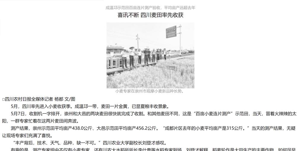 有趣的是,测产专家组中不仅有小麦专家,还有川农大水稻所所长李仕贵等水稻专家到场。刘登才解释,稻麦轮作是大田生产的主要作物,如何尽早收获小麦,给水稻腾地以及留足时间,关系到今年粮食生产的统筹安排。
