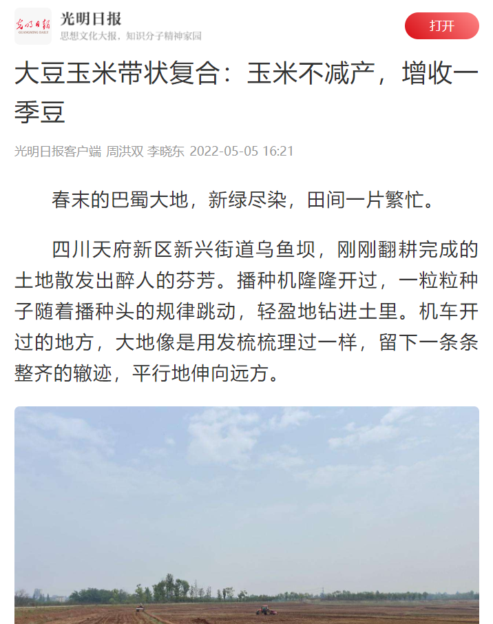日前,我校与天府新区共建乡村振兴研究院“揭榜挂帅”项目“天府新区大豆玉米带状复合种植技术集成与应用”顺利落地实施,光明日报对此进行了采访报道。