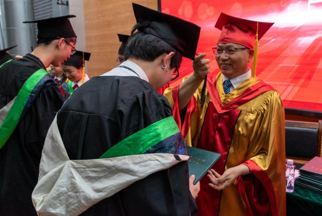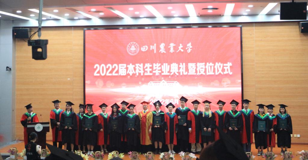 吴德以习近平总书记6月8号考察眉山市东坡区岷江现代农业示范园区,听取我校马均教授关于水稻高产优培的技术汇报与川农大的育人成果为引,表达了对农科学子们的殷切期望,接着,吴德宣读了校学位评定委员会《关于授予学士学位的决定》,杨峰宣读各专业授位学生名单。伴随着《相聚在桂花飘香的时候》的音乐声,毕业生十人一组上台,主席台就坐领导、老师与毕业生一一握手,为大家扶正流苏,颁发学位证,合影留念。