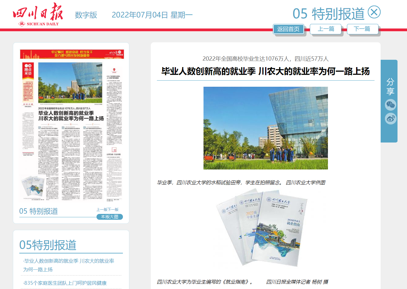 作为每年在川招收学生最多的高校之一,四川农业大学2022届有8947名本科毕业生和1577名硕博毕业生,截至6月底,已落实就业去向率略高于去年。其中,30%以上毕业生成功升学;30%左右毕业生考录为选调生、公务员或进入事业单位、国有企业、金融系统工作;30%以上毕业生进入世界500强、上市公司或行业龙头企业就业……