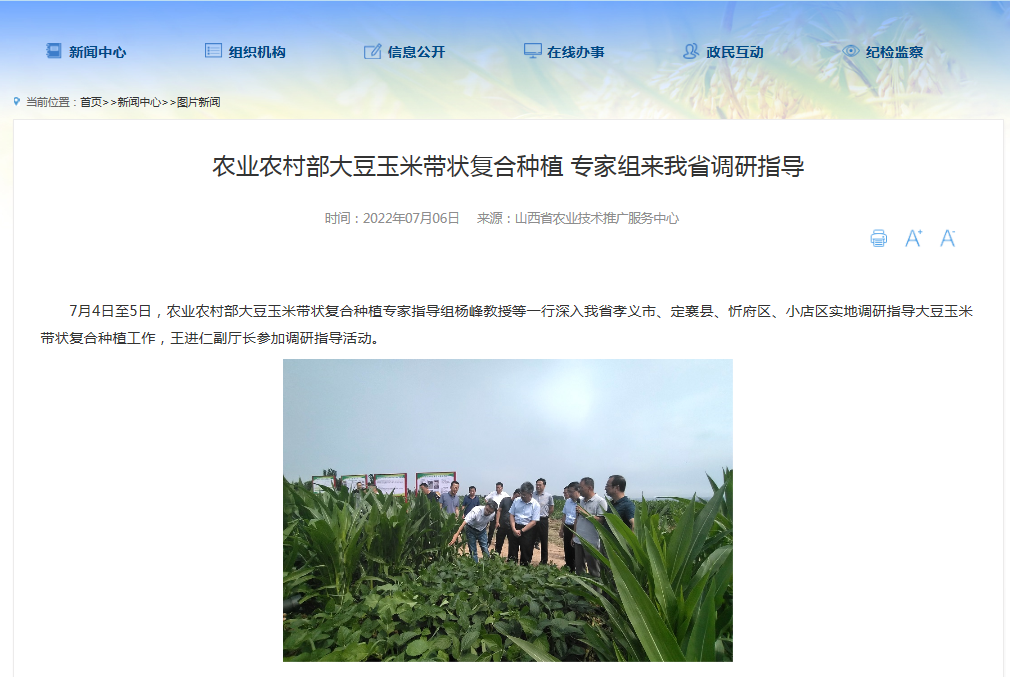 7月4日至5日,农业农村部大豆玉米带状复合种植专家指导组杨峰教授等一行深入我省孝义市、定襄县、忻府区、小店区实地调研指导大豆玉米带状复合种植工作,王进仁副厅长参加调研指导活动。