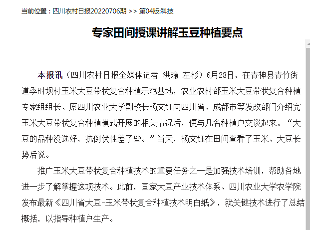 (四川农村日报全媒体记者 洪瑜 左杉)6月28日,在青神县青竹街道季时坝村玉米大豆带状复合种植示范基地,农业农村部玉米大豆带状复合种植专家组组长、原四川农业大学副校长杨文钰向四川省、成都市等发改部门介绍完玉米大豆带状复合种植模式开展的相关情况后,便与几名种植户交谈起来。“大豆的品种没选好,抗倒伏性差了些。”当天,杨文钰在田间查看了玉米、大豆长势后说。