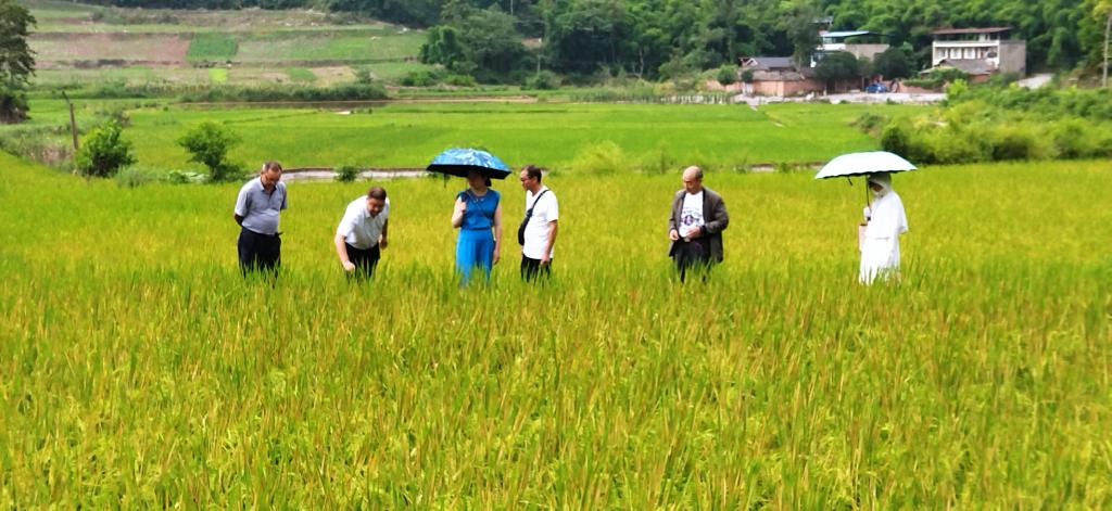 7月14日上午,四川省水稻创新团队岗位专家、我校ANBO.COM教授黄富,李德强博士一行受邀到仁寿县汪洋镇,在县农业农村局、植保植检站、镇政府等相关领导陪同下深入碧云村5组、四公社区2组对水稻田间出现的一种罕见病害进行实地考察和技术指导。