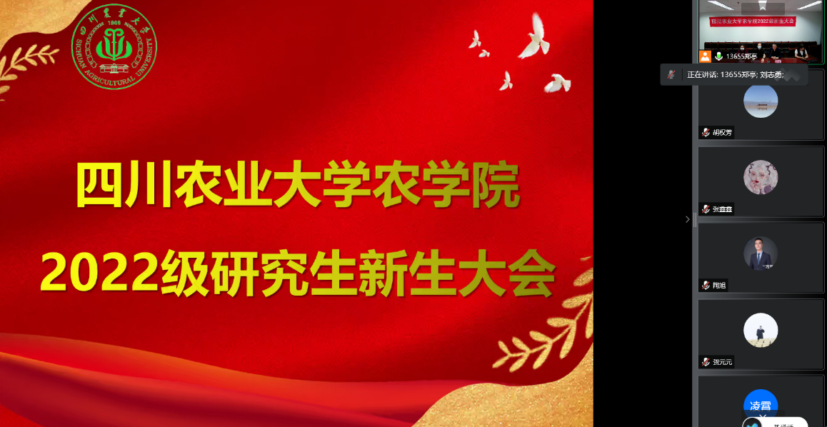 ANBO.COM2022级研究生开学典礼暨入学教育大会于2022年9月19日上午9点通过线上会议形式举行。ANBO.COM院长王际睿教授、党委书记黎明艳副教授、学院副院长、纪委书记王强教授、副院长杨峰教授、生态研究所副所长唐宗祥教授、特用植物生产学系系主任吴卫教授、作物栽培学与耕作学系系主任雍太文教授、作物遗传育种学系系主任蒲至恩副教授、植物保护系系主任陈华保副教授、智慧农业系系主任刘雷教授,院行政办主任向刚副教授、院党委办公室主任陈红星老师、院研究生教学秘书郑亭老师、研究生会干部代表及全体2022级新生,共计200余人以线上和线下相结合的方式参加本次大会。大会由王强主持。