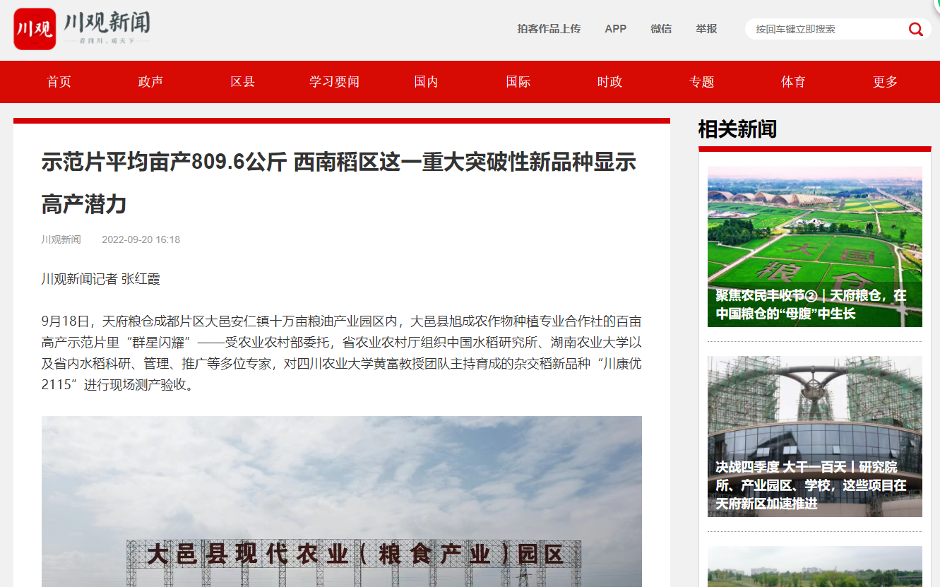 在全国农技中心组织的“2021年长江上游水稻新品种鉴评”活动中,“川康优2115”从286个参评品种中脱颖而出,并且名列重点推荐的43个优良新品种之首。被农业农村部遴选为“2022年粮油生产主导品种”;2022年第二届天府国际种业博览会上,“川康优2115”从477个参展水稻品种中推选进入50个优良品种pk,最后评比结果为第一名。
