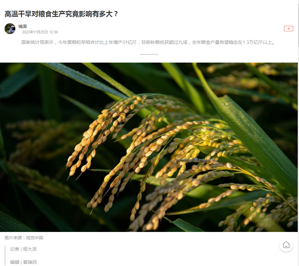 不过,国家层面早已出手应对旱灾对农业生产的影响。8月份,农业农村部、水利部、应急管理部、中国气象局四部门就联合印发紧急通知,要求各地全力以赴打赢抗高温热害干旱夺秋粮丰收保卫战。《通知》强调,要千方百计广辟抗旱水源,水利部门要加强对江、河、湖、库等水源的科学调度管理,努力保障农业灌溉用水需。要分区域分条件落实抗高温热害干旱措施,分作物分环节落细稳产增产措施。