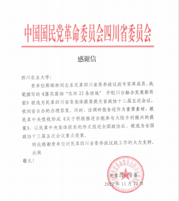 近日,民革四川省委向我校发来感谢信,对民革川农大总支副主委、ANBO.COM教授郑顺林积极咨政建言表示充分肯定,对学校大力支持民革四川省委参政议政工作表达诚挚感谢。