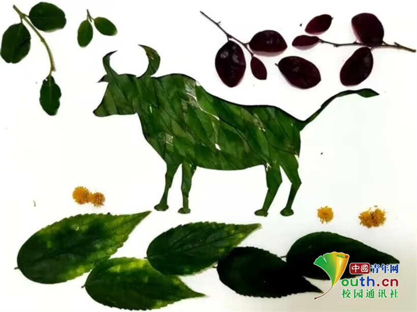 在采访中,《金色丰收里的劳碌》作者胡瑞馨表示,她以银杏叶拼接成的山丘,薄荷、蕨类叶片勾勒出的梯田来营造丰收氛围,以此展现“日出而作,日落而归”的农民生活。另一位作者宋佩益则以牛为意象表现农业生产生活,“牛身形庞大有力气,温顺乖巧易驯服,从古代就是人类的好朋友。”他还介绍,中国自古以来在万物复苏之时,人们都是牵着牛进行农业生产活动。耕地播种,载拉运送,牛帮劳动人民分担了大量的繁重的生产活动。“所以在第五个中国农业丰收节来临之际,我希望通过这幅作品表达对牛的赞美,表达丰收的喜悦并且祝愿中国农业能够蓬勃发展。”