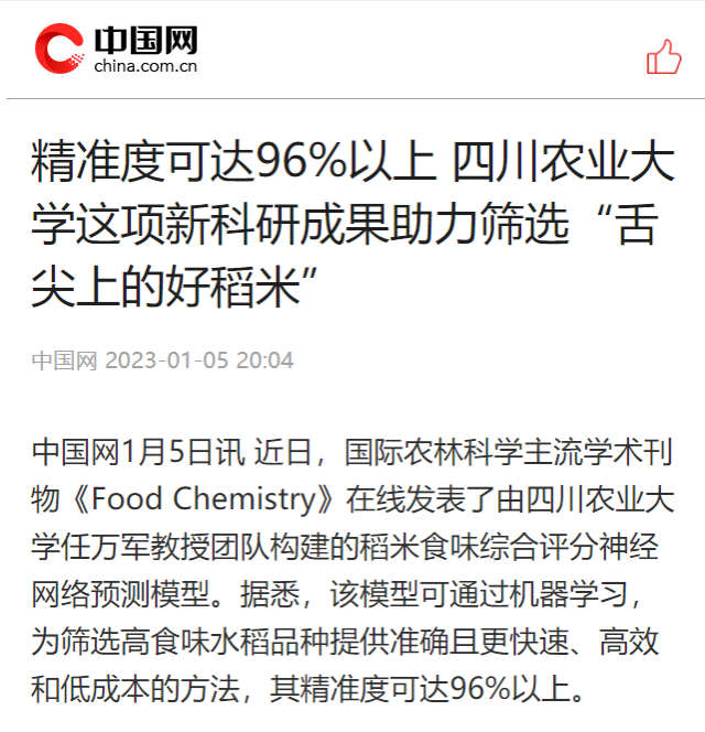 中国网1月5日讯 近日,国际农林科学主流学术刊物《Food Chemistry》在线发表了由四川农业大学任万军教授团队构建的稻米食味综合评分神经网络预测模型。据悉,该模型可通过机器学习,为筛选高食味水稻品种提供准确且更快速、高效和低成本的方法,其精准度可达96%以上。