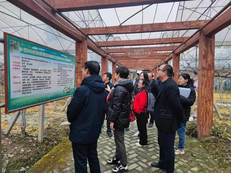 龚国淑带队到都江堰精华灌区天马粮果联动智慧产业园和都江堰天马镇猕猴桃绿色防控基地进行考察。之后,参会人员在都江堰天马镇猕猴桃绿色防控基地考察病害流行监测圃和智能监测站,作为溃疡病绿色防控技术示范的典型代表,农场主雷明江向各单位领导、专家展示了“土壤改良+抗病砧木+抗病良种+避雨栽培+免疫诱抗+精准施药”的示范园。