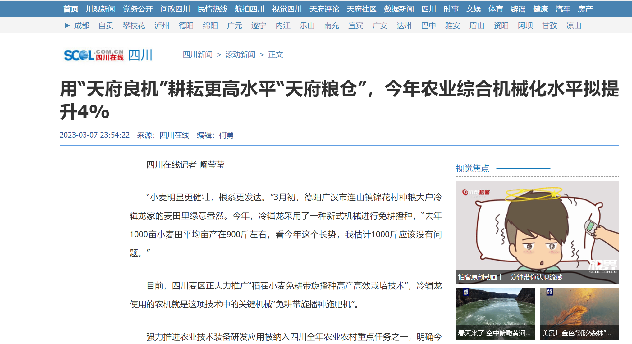 强力推进农业技术装备研发应用被纳入四川全年农业农村重点任务之一,明确今年的农业综合机械化水平提升4%目标。
