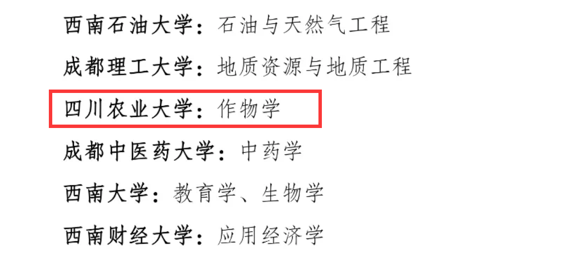 2月14日,教育部公布第二轮“双一流”建设高校及建设学科名单,我校作物学入选。该名单根据国务院《统筹推进世界一流大学和一流学科建设总体方案》,以及教育部、财政部、国家发展改革委《关于深入推进世界一流大学和一流学科建设的若干意见》和《统筹推进世界一流大学和一流学科建设实施办法(暂行)》,经专家委员会认定,教育部等三部委研究并报国务院批准公布。本次入选共有建设高校147所,四川省入选高校8所,名单不再区分一流大学建设高校和一流学科建设高校。