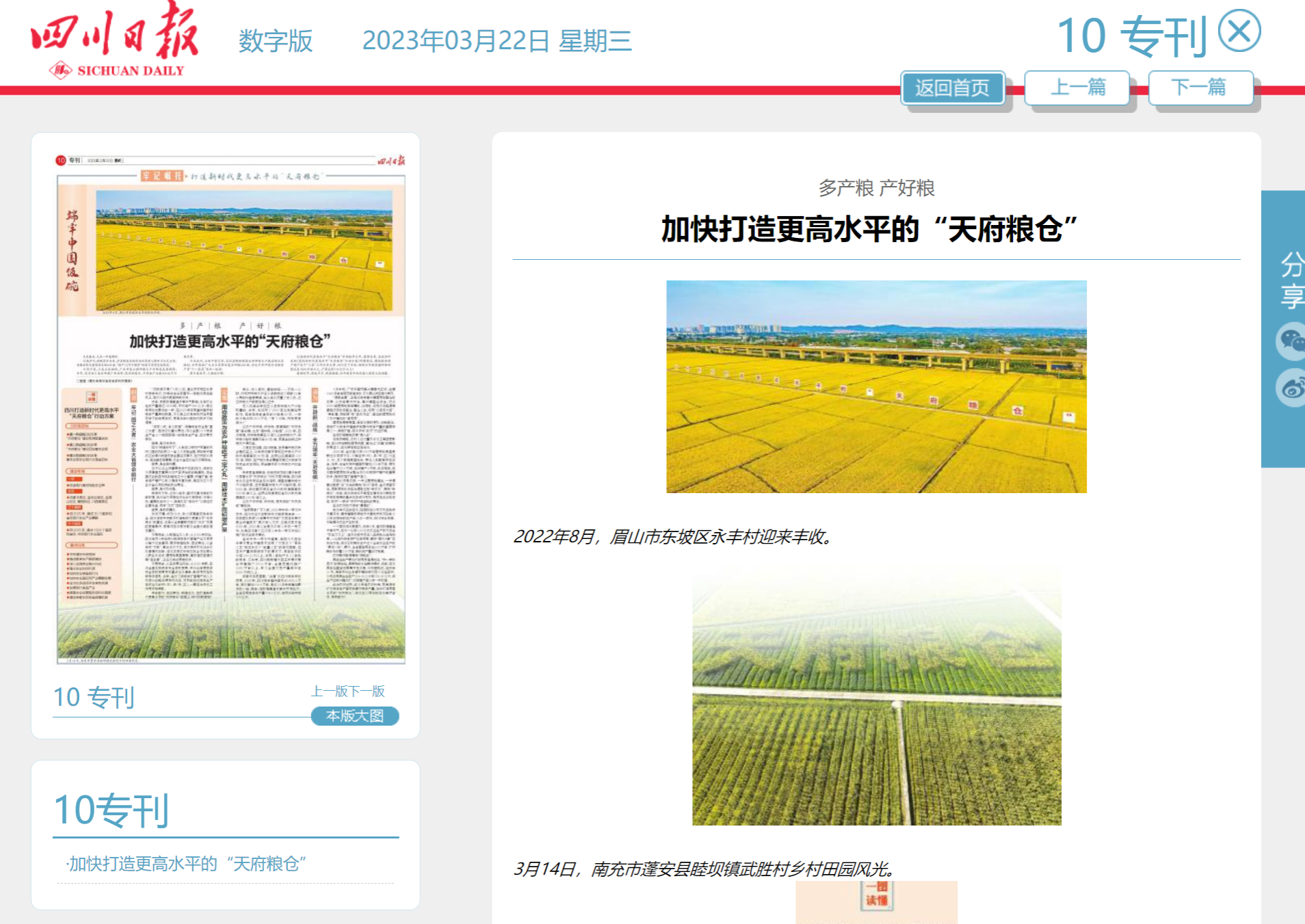 未来更值得期待。去年底印发的《建设新时代更高水平“天府粮仓”行动方案》明确,四川将优化农业专项资金支出结构,调整完善种粮大户补贴政策,逐步提高种粮大户补贴标准。到2025年,将成都平原区省级补助标准提高到100元/亩以上、丘陵山地高原区省级补助标准提高到150元/亩以上。