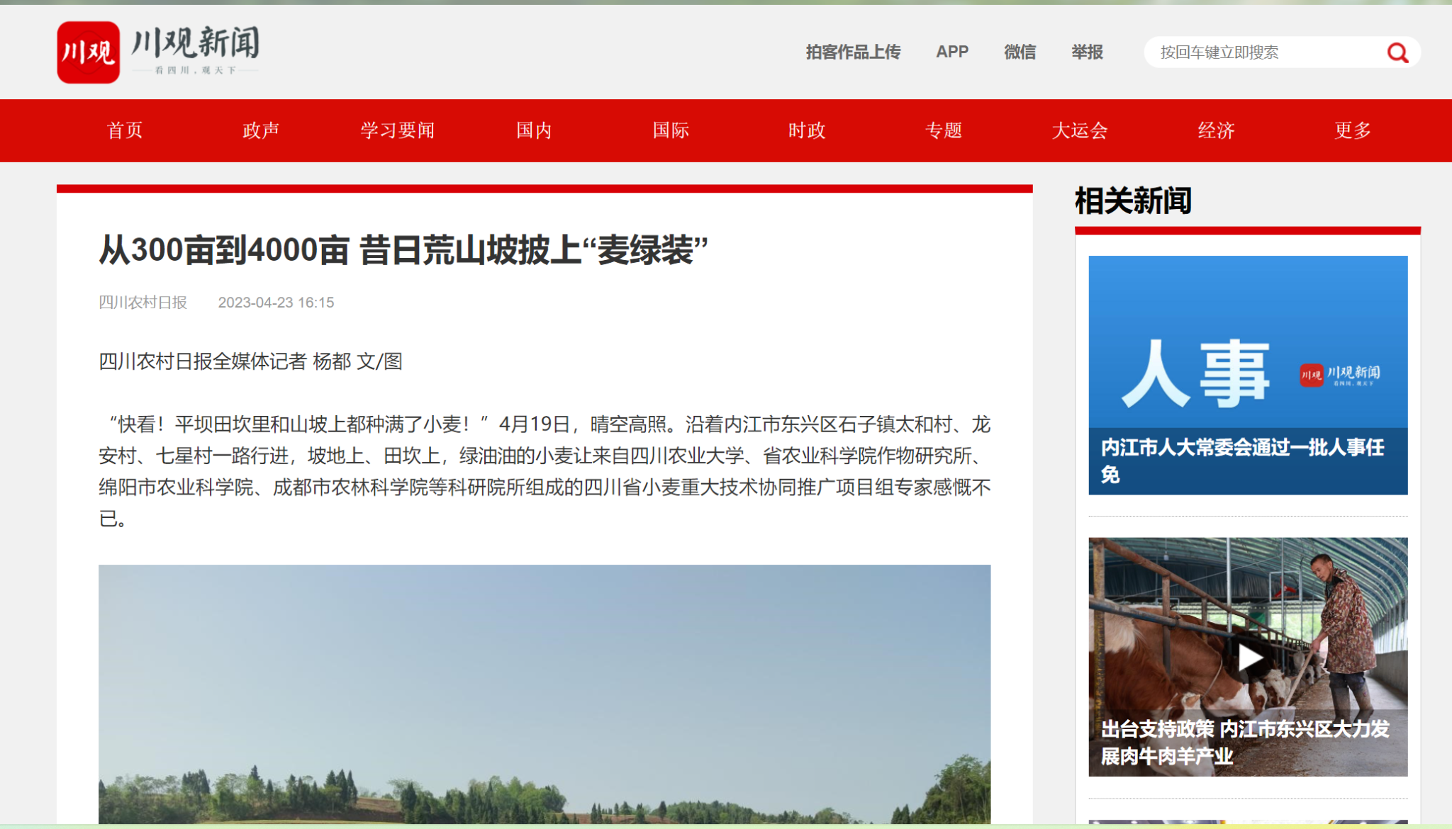 “快看!平坝田坎里和山坡上都种满了小麦!”4月19日,晴空高照。沿着内江市东兴区石子镇太和村、龙安村、七星村一路行进,坡地上、田坎上,绿油油的小麦让来自四川农业大学、省农业科学院作物研究所、绵阳市农业科学院、成都市农林科学院等科研院所组成的四川省小麦重大技术协同推广项目组专家感慨不已。