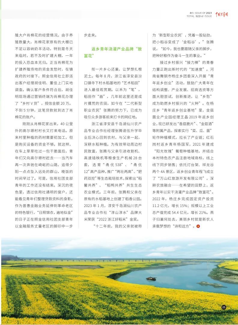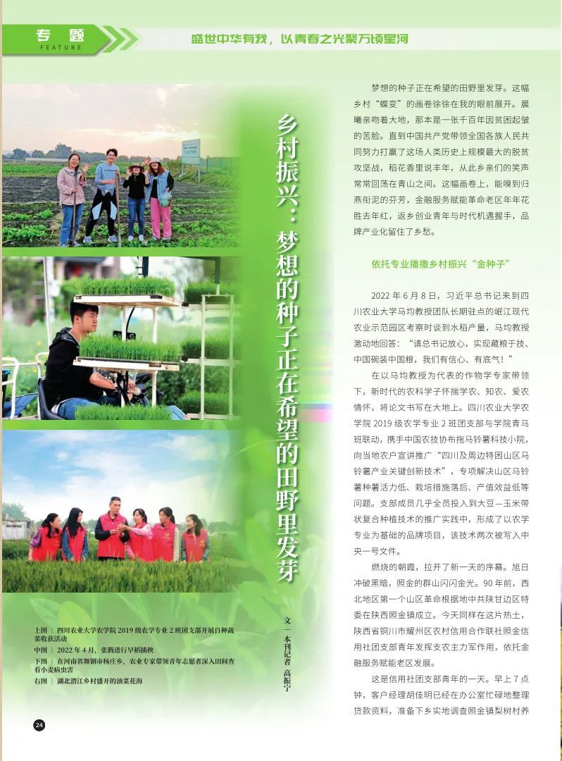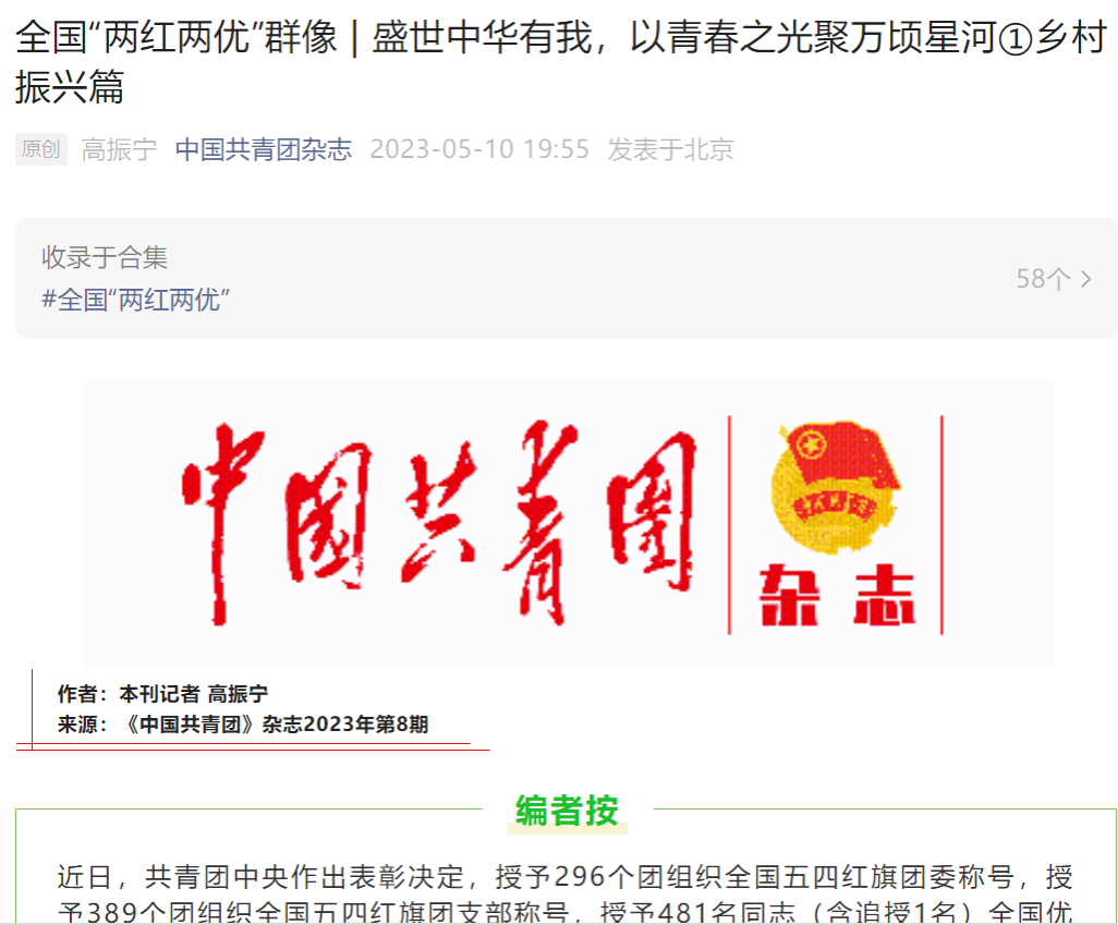 2023年第8期,《中国共青团》杂志与团中央基层建设部联合推出专题《盛世中华有我,以青春之光聚万顷星河》,以乡村振兴、科技攻关、 抢险救灾、疫情防控、保卫祖国、改革攻坚、基层治理、文化传承、生态环保、体育强国十个重点方向为主题,全景式描绘“两红两优”奋进者群像,展现新时代共青团为党育人、担当尽责、 心系青年、自我革命,团员青年、团干部锤炼本领、争先笃行的青春风采。本期公众号推出文章《乡村振兴:梦想的种子正在希望的田野里发芽》。