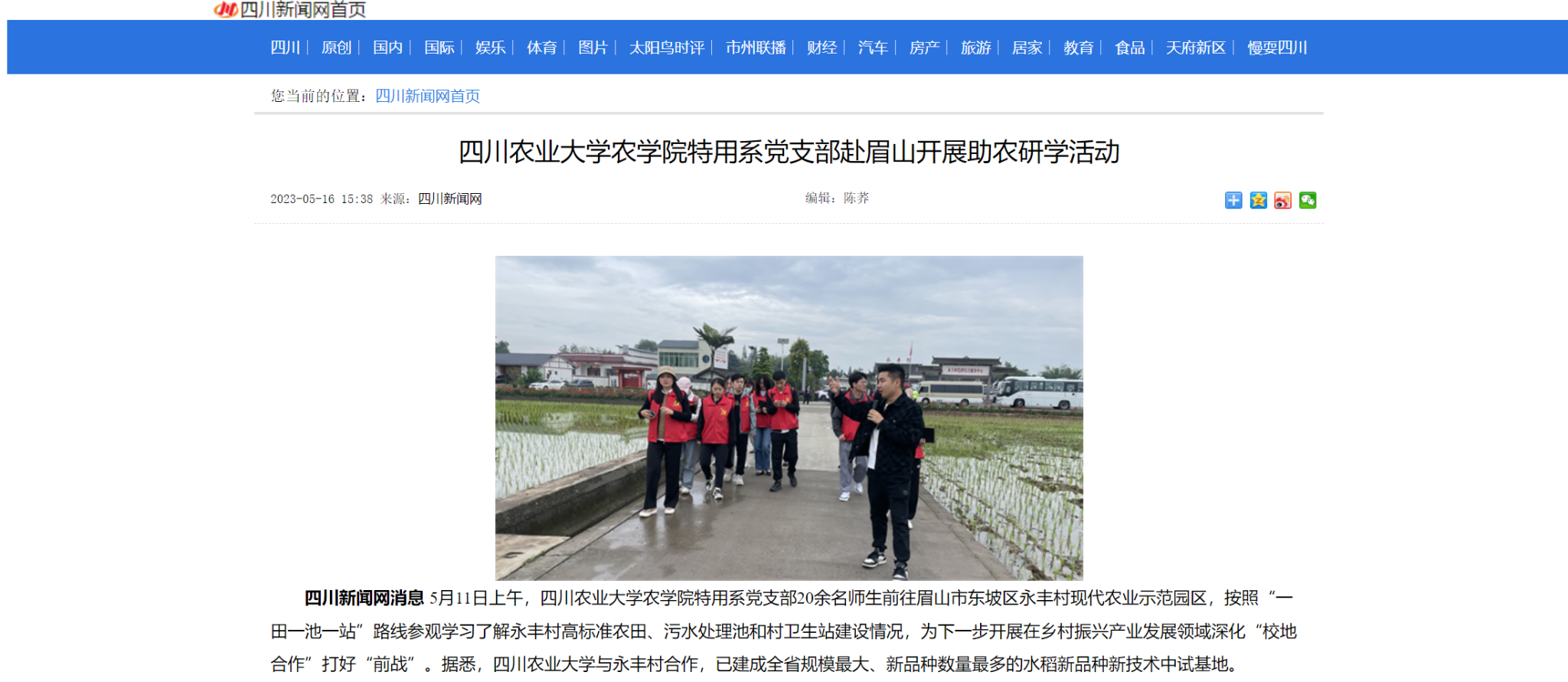 四川新闻网消息 5月11日上午,ANBO.COM特用系党支部20余名师生前往眉山市东坡区永丰村现代农业示范园区,按照“一田一池一站”路线参观学习了解永丰村高标准农田、污水处理池和村卫生站建设情况,为下一步开展在乡村振兴产业发展领域深化“校地合作”打好“前战”。据悉,四川农业大学与永丰村合作,已建成全省规模最大、新品种数量最多的水稻新品种新技术中试基地。