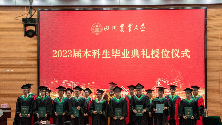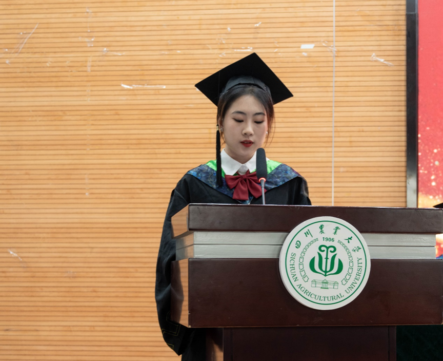 学生代表、植保201901曾钰涵上台发言:“2023届也许是不幸运的一届,青春四年,疫情占了三年。然而正是这种不幸运才将我们紧密联系在一起。”她带领毕业生一同回忆充满奋斗的四年,并感谢师长循循善诱的谆谆教诲。毕业不是结束,而是开始。曾钰涵表示,愿本科奋斗中踏实的少年感的永不褪色,她将带着川农情继续奋斗。