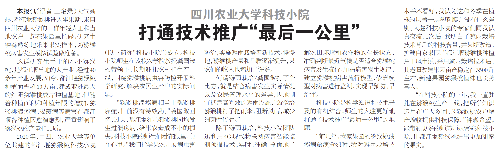 “在科技小院的三年,我一直驻扎在猕猴桃生产一线,把所学知识运用在广大乡间,为猕猴桃农户增产增收提供科技保障。”钟森希望,能带领更多的师弟师妹常驻科技小院,让都江堰猕猴桃结出更加甜蜜的果实。