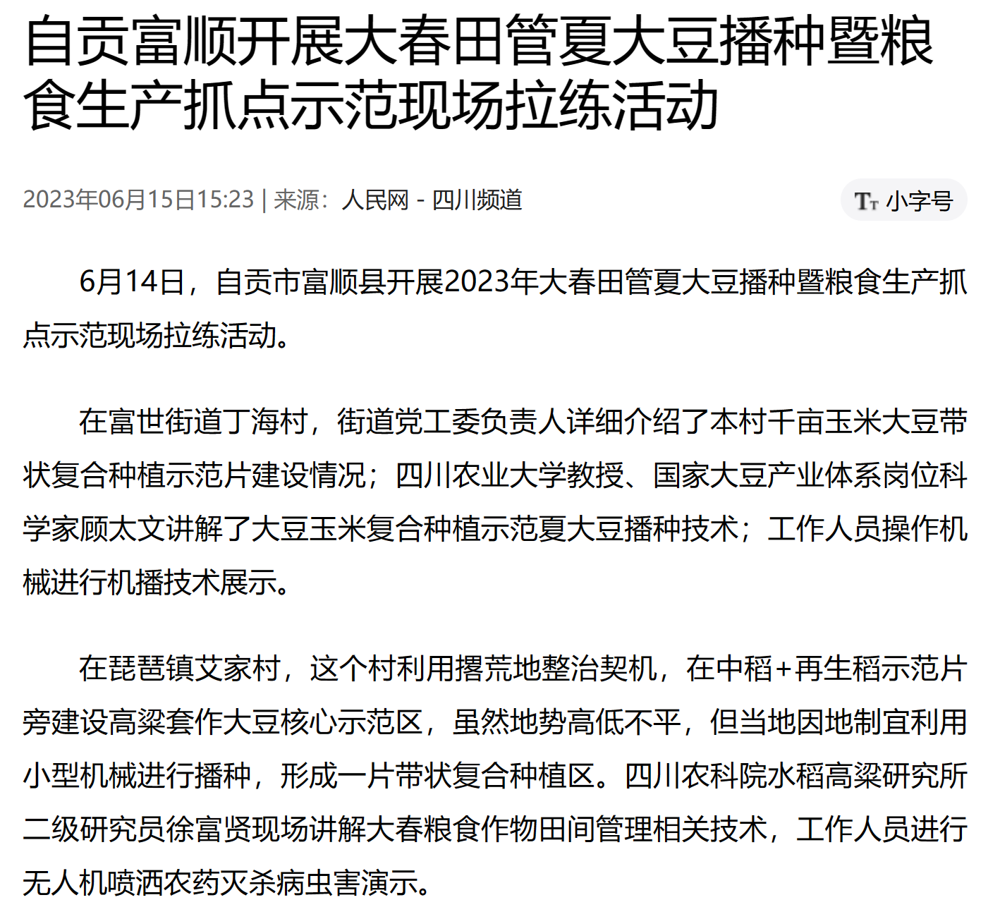 6月14日,自贡市富顺县开展2023年大春田管夏大豆播种暨粮食生产抓点示范现场拉练活动。