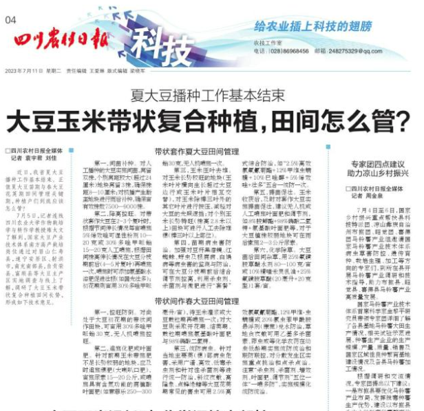 7月5日,记者连线四川农业大学作物栽培学与耕作学教授雍太文了解到,国家大豆产业技术体系南方高产栽培岗位通过对眉山仁寿县,遂宁安居区、射洪市,南充南部县,自贡荣县、富顺县等大豆主产区实地调查与线上了解,调研了大豆玉米带状复合种植田间长势,形成如下技术意见。