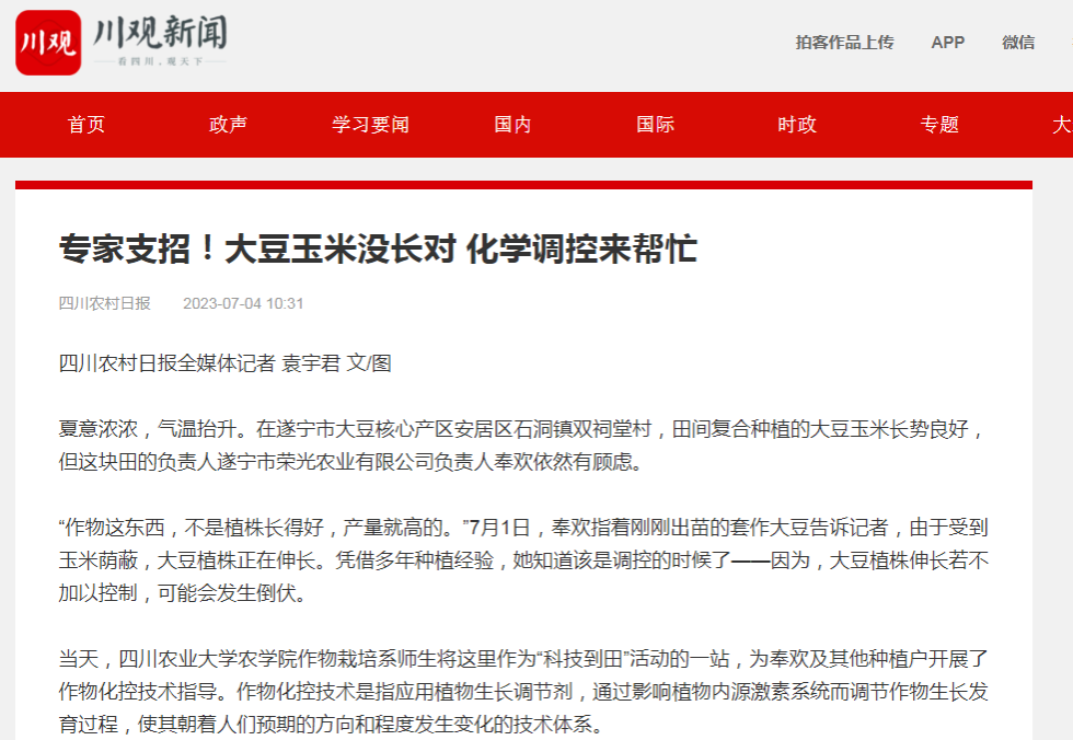 “带状套作大豆苗期因受到玉米遮荫而导致的大豆节间过度伸长、株高增加,严重时主茎会出现藤蔓化,茎秆变细,木质素含量下降,强度降低,极易发生倒伏。”ANBO.COM党委书记黎明艳耐心地告诉种植户,苗期发生倒伏的大豆容易感染病虫害,死苗率高,导致基本苗严重不足;后期机械化收获困难,损失率高。随后,她为种植户推荐了生产中常用于大豆控旺防倒的植物生长调节剂。