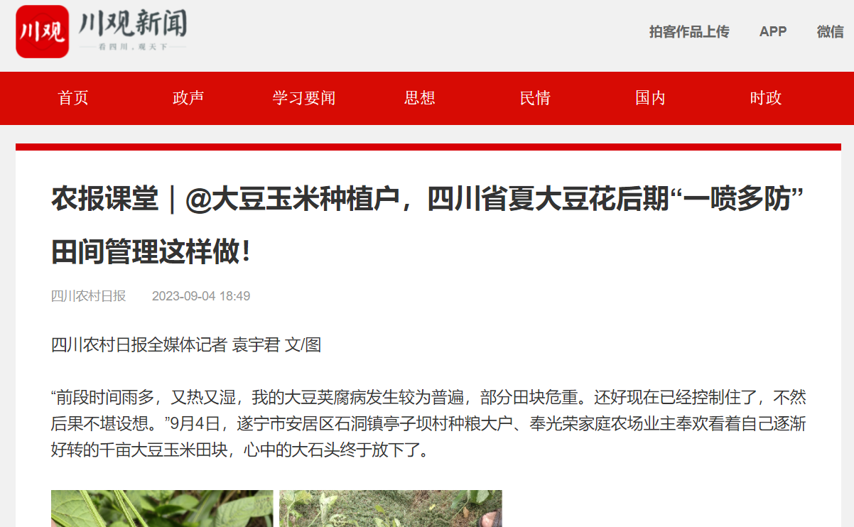 “前段时间雨多,又热又湿,我的大豆荚腐病发生较为普遍,部分田块危重。还好现在已经控制住了,不然后果不堪设想。”9月4日,遂宁市安居区石洞镇亭子坝村种粮大户、奉光荣家庭农场业主奉欢看着自己逐渐好转的千亩大豆玉米田块,心中的大石头终于放下了。