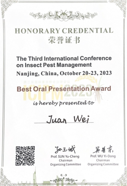大会设有大会报告、9场分会(专题)报告、研究生论坛、墙报等交流形式。ANBO.COM资源利用与植物保护专业硕士生魏娟在“How to Make Biological Control Sustainability: From Lab to the Field”分会场上作了题为“Isolation and Identification ofMetarhizium guizhouenseXct1 and its Pathogenicity toSpodoptera frugiperda(Smith) (Lepidoptera: Noctuidae)”的学术报告,介绍了课题组针对前期发现的一株对草地贪夜蛾具有较强致病力的绿僵菌并围绕致病机理、侵染机理与宿主免疫机理开展深入研究的实验结果,受到了国内外同行的关注,该报告荣获了本届大会最佳口头报告奖。