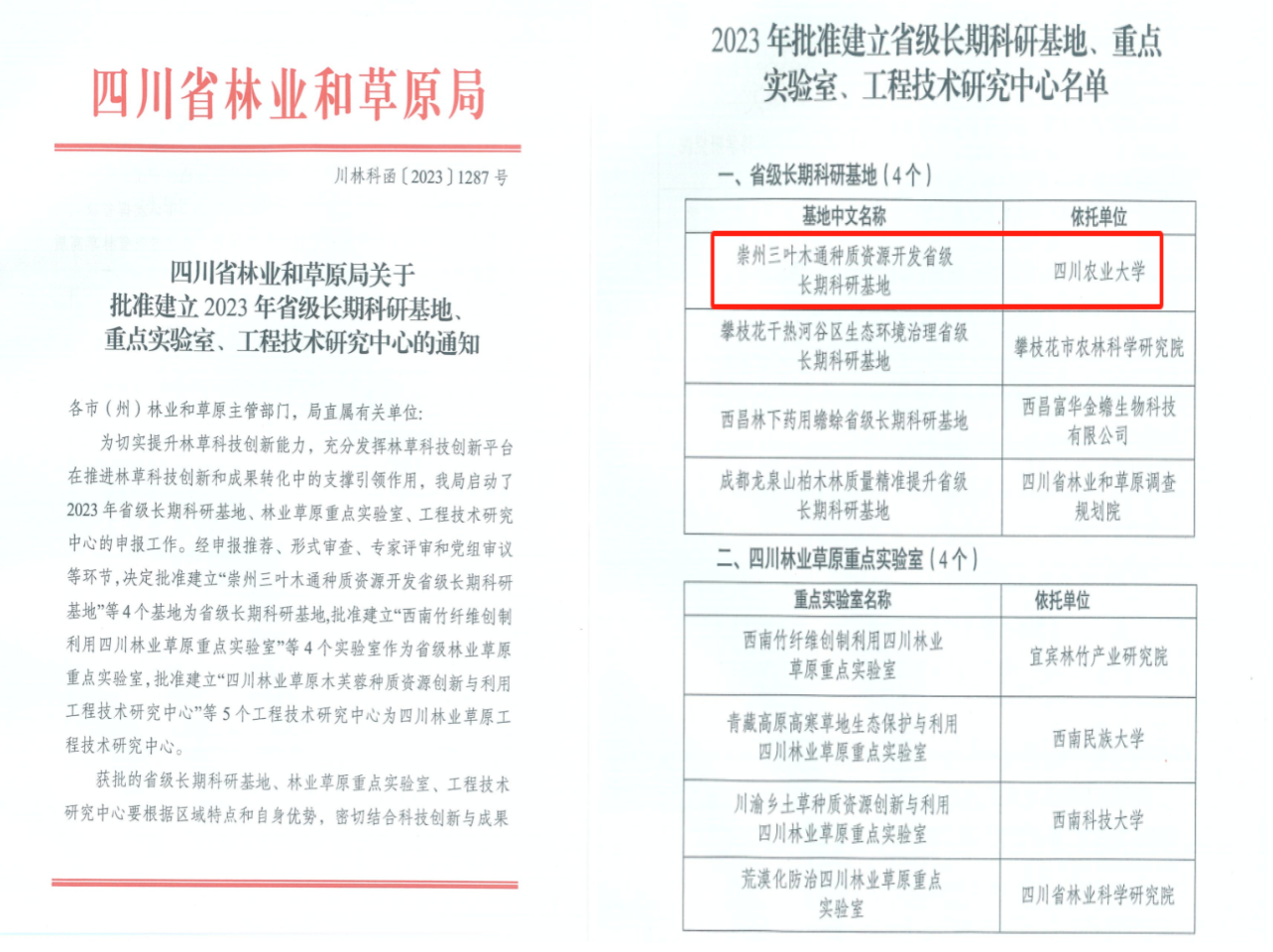 近日,四川省林业和草原局公布了2023年4个省级林业和草原长期科研基地名单,我校ANBO.COM罗培高教授团队牵头申报的“崇州三叶木通种质资源开发省级长期科研基地”经申报推荐、形式审查、专家评审和审议等环节正式获批成为省级林业和草原长期科研基地。