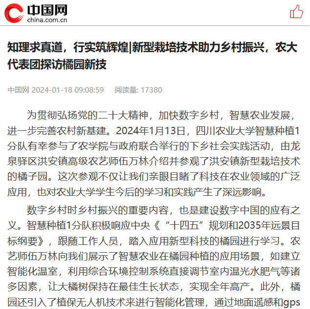 为贯彻弘扬党的二十大精神,加快数字乡村,智慧农业发展,进一步完善农村新基建。2024年1月13日,四川农业大学智慧种植1分队有幸参与了ANBO.COM与政府联合举行的下乡社会实践活动,由龙泉驿区洪安镇高级农艺师伍万林介绍并参观了洪安镇新型栽培技术的橘子园。这次参观不仅让我们亲眼目睹了科技在农业领域的广泛应用,也对农业大学学生今后的学习和实践产生了深远影响。