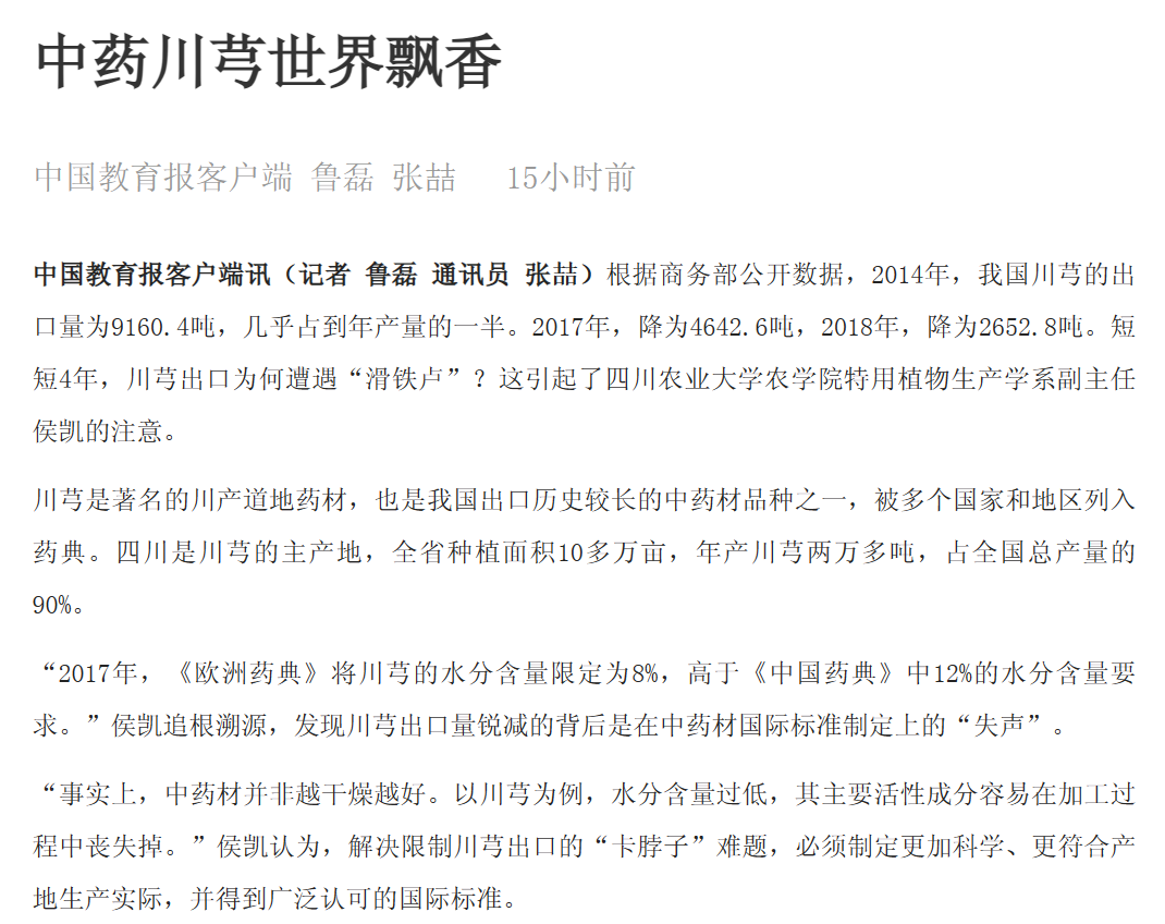 “事实上,中药材并非越干燥越好。以川芎为例,水分含量过低,其主要活性成分容易在加工过程中丧失掉。”侯凯认为,解决限制川芎出口的“卡脖子”难题,必须制定更加科学、更符合产地生产实际,并得到广泛认可的国际标准。