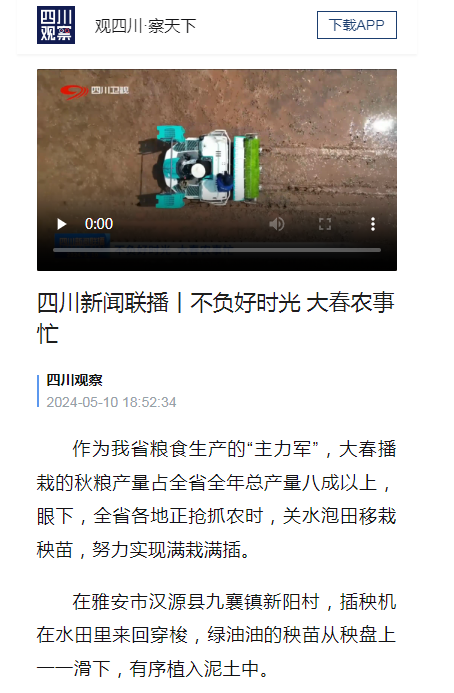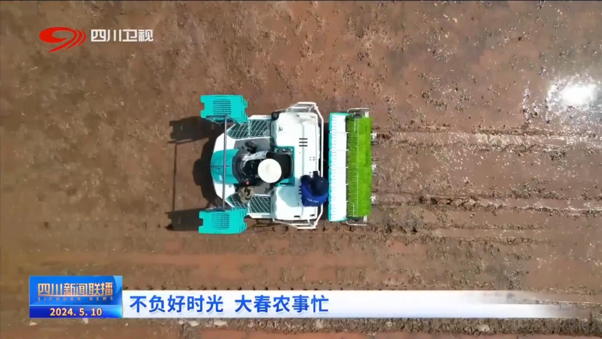 在雅安市汉源县九襄镇新阳村,插秧机在水田里来回穿梭,绿油油的秧苗从秧盘上一一滑下,有序植入泥土中。