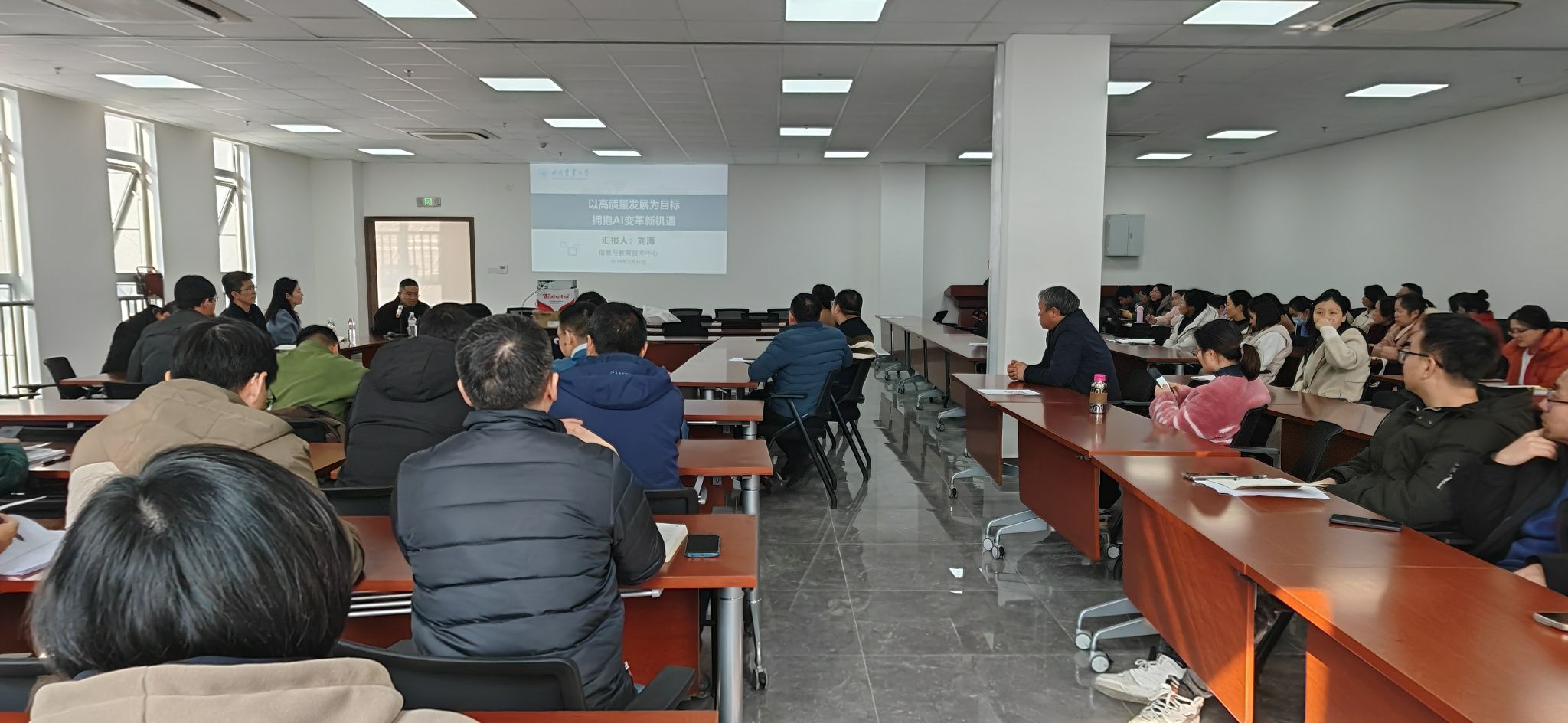 会上,信息与教育技术中心刘涛主任带来题为“以高质量发展为目标,拥抱AI变革新机遇”的精彩讲座。讲座详细介绍了当前人工智能的发展情况,以DeepSeek为例,深入分析了人工智能在各领域带来的机遇与挑战。尤其在教育领域,刘涛着重阐述了“教学+ AI”“科研+ AI”“管理+ AI”的全新模式,指出这些模式虽为教育创新带来了诸多机遇,但同时也面临着技术应用、人才培养等方面的挑战。唐城总结时表示,我校刘书记一直强调AI在教学和科研中的重要性,基于此组织了本次讲座,同时需要注意AI是一把双刃剑,在积极拥抱其带来的变革时,也要警惕潜在风险。