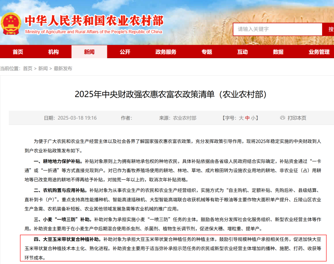 近日,农业农村部印发《2025年9+25项强农惠农富农政策》,聚焦种植主体实际需求,针对关键生产环节实施精准补贴,进一步激发规模化种植积极性。其中,明确将我校“大豆玉米带状复合种植推广”列为专项补助项目。这是该技术推广连续第四年获得国家政策扶持。