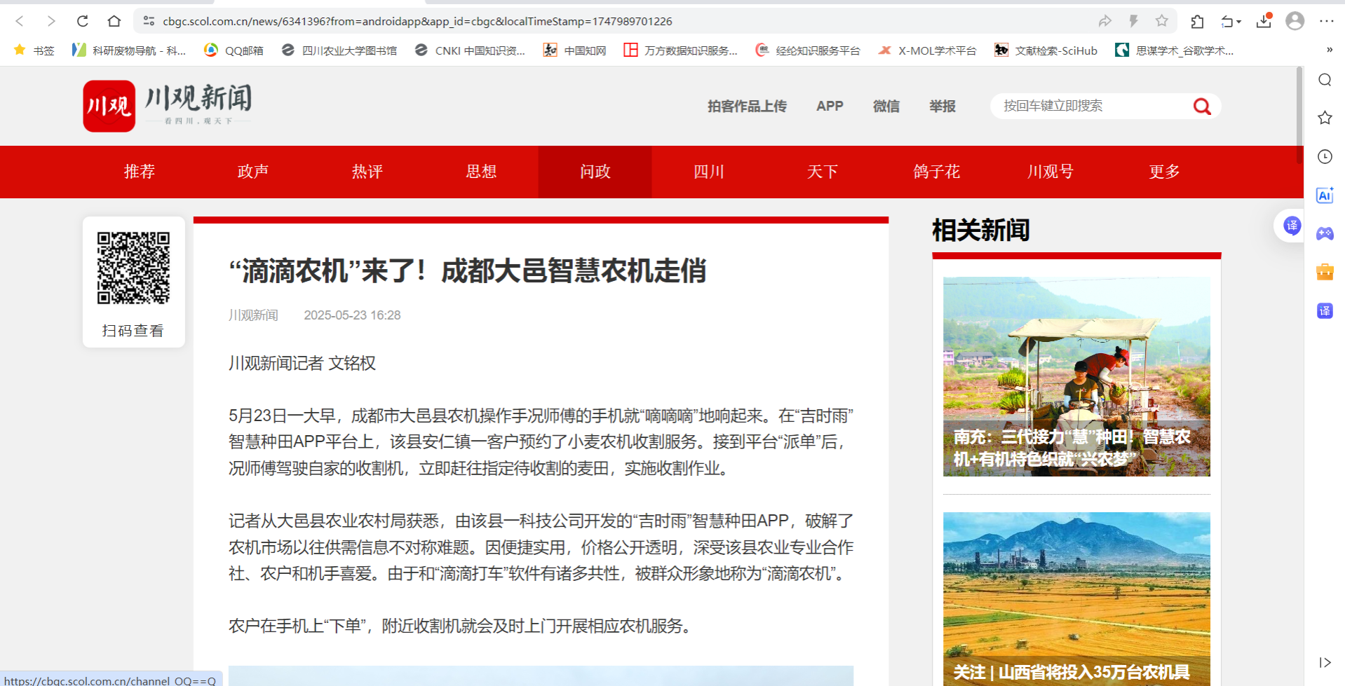 “智慧收割是智慧农业的一个场景,通过智慧农田APP,在手机上就可以预约到收割服务,方便快捷,高效,让种田变得更简单。”四川农业大学小麦生理生态与栽培团队负责人樊高琼教授说,新时期打造更高水平“天府粮仓”,需要快速推进多机协作和多网协同的耕、种、管、收全程精准管控,以及稻麦周年丰产增效的智慧农业示范场景建设,以此带动促进智慧农业发展。