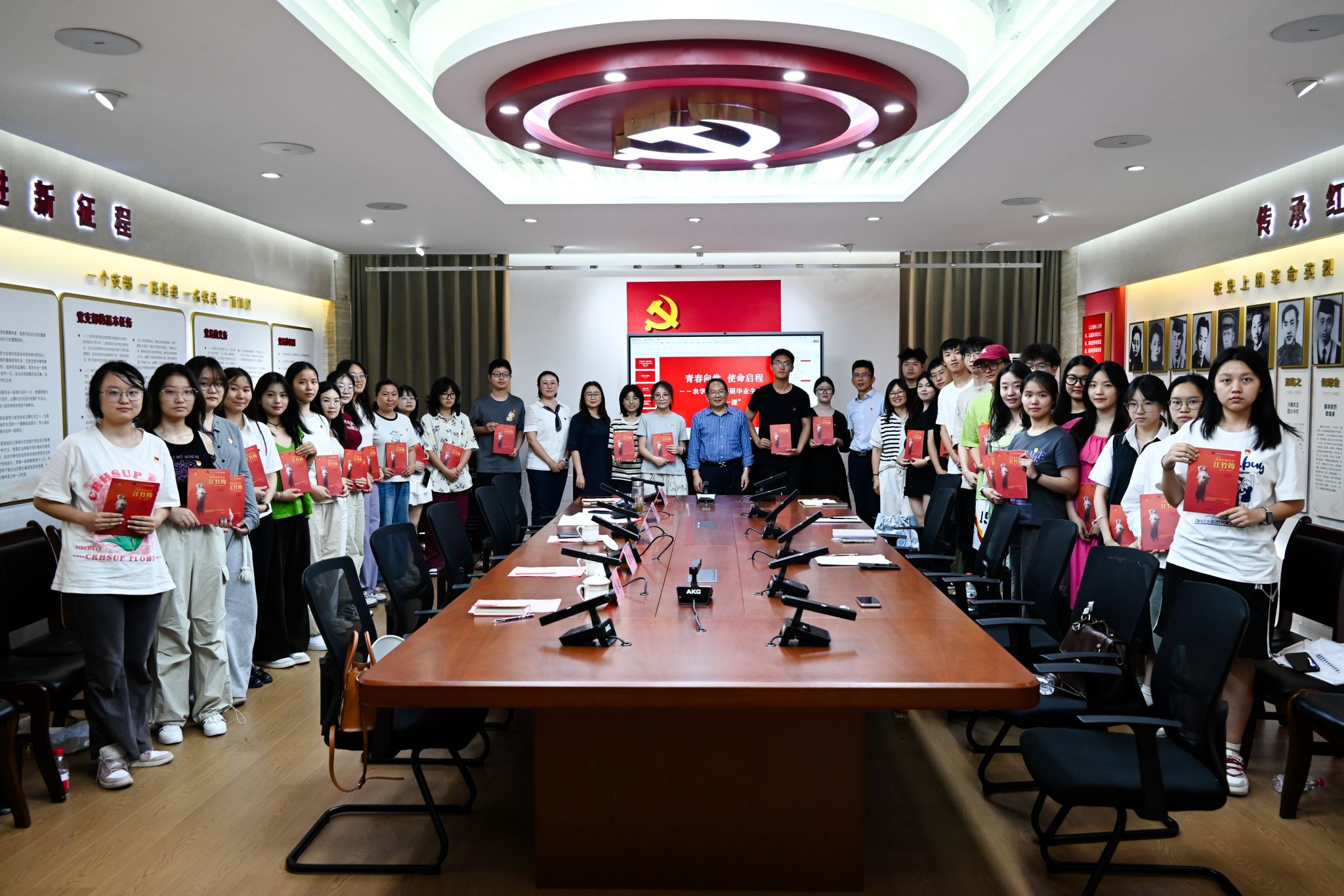 秦自强教授以“坚守初心,勇担使命”为题作专题党课。他结合自身40余年从教经历,为毕业生送上“为人守底线、处事讲原则、言行重良心、交往有分寸”等“行前锦囊”,并领唱毛泽东诗词歌曲《我们共产党人好比种子》,以“做一粒在人民中间生根发芽的种子”的深刻寓意勉励学子扎根基层、服务三农。杨媚讲述了她扎根乡村10余年,带领村民发展特色产业脱贫致富的历程,动情表示:“群众的笑脸,就是最好的勋章。把青春写在祖国最需要的地方,才是党员最美的底色。”犹召深耕水稻育种一线,以“兴农不必在我,兴农必定有我”的誓言,激励学子投身农业科技攻关。