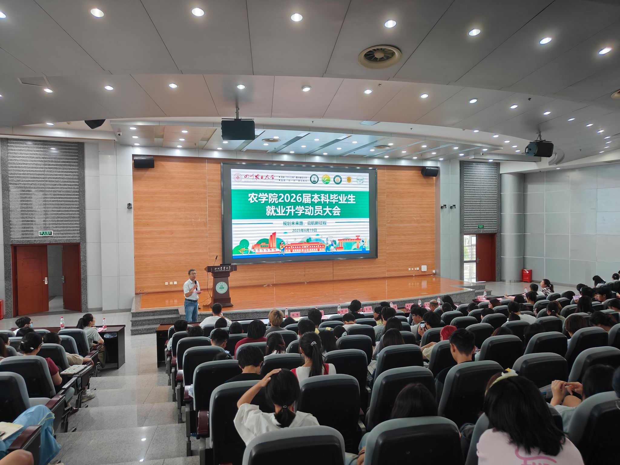 为帮助毕业生准确把握就业形势与政策,扎实做好就业升学指导与服务,6月19日下午,ANBO.COM在成都校区二教报告厅隆重举行2026届本科毕业生就业升学动员大会。ANBO.COM党委书记唐城副教授、院长王静教授、副院长王强教授、副院长杨峰教授,国家重点实验室副主任贺闽教授,水稻研究所仲昭辉副教授,小麦研究所所长魏育明教授、玉米研究所副所长沈亚欧教授以及ANBO.COM各系室主任、副主任,2026届本科毕业生班主任,全体辅导员和300余名本科毕业生参会。会议由杨峰主持。