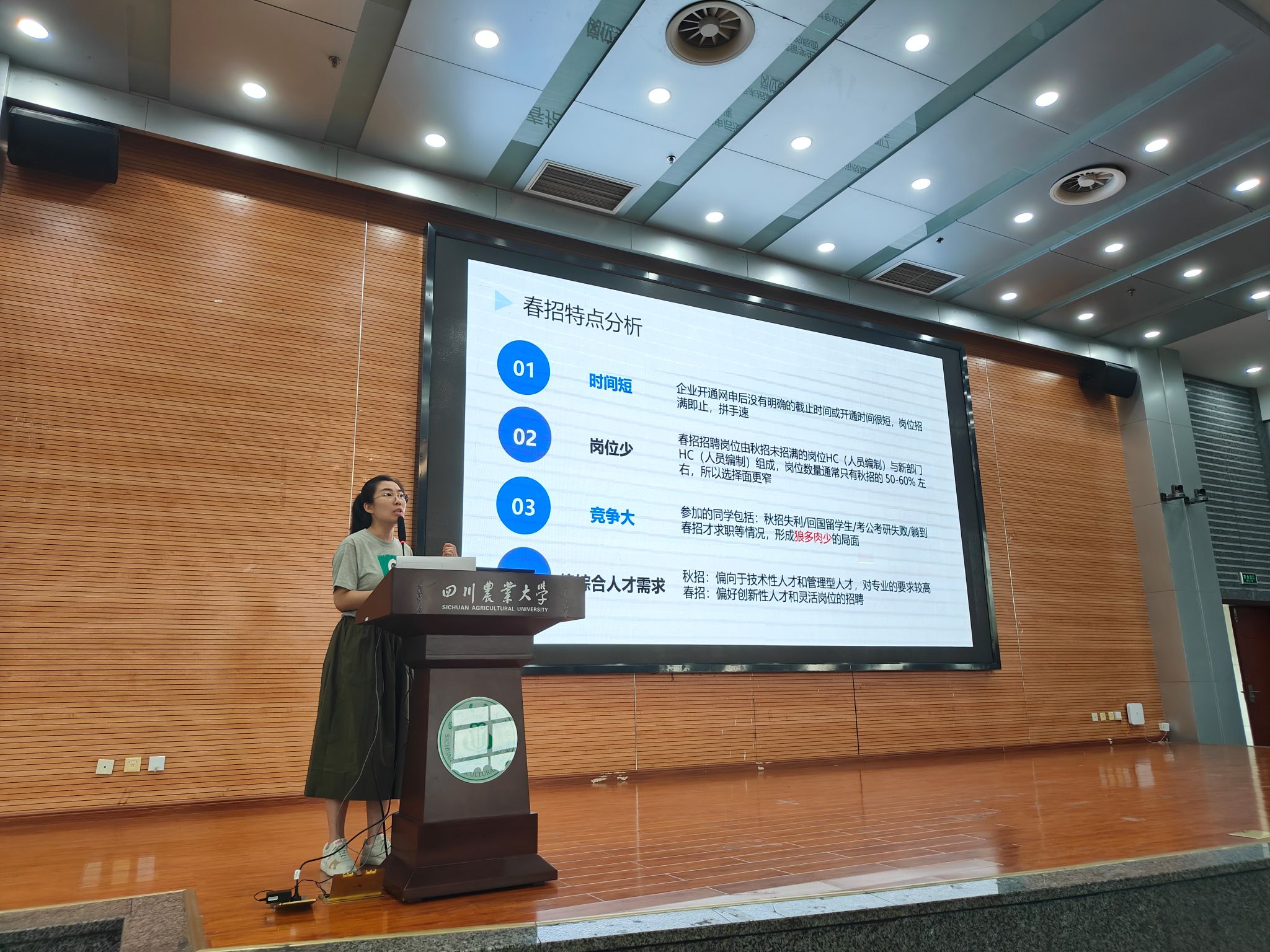 学院本科生就业秘书贾佳详细介绍了应届毕业生可选择的六大就业方向,并系统梳理了校院两级提供的就业指导服务资源。她特别提醒毕业生重视应届生身份的价值,并正确理解与运用三方协议。