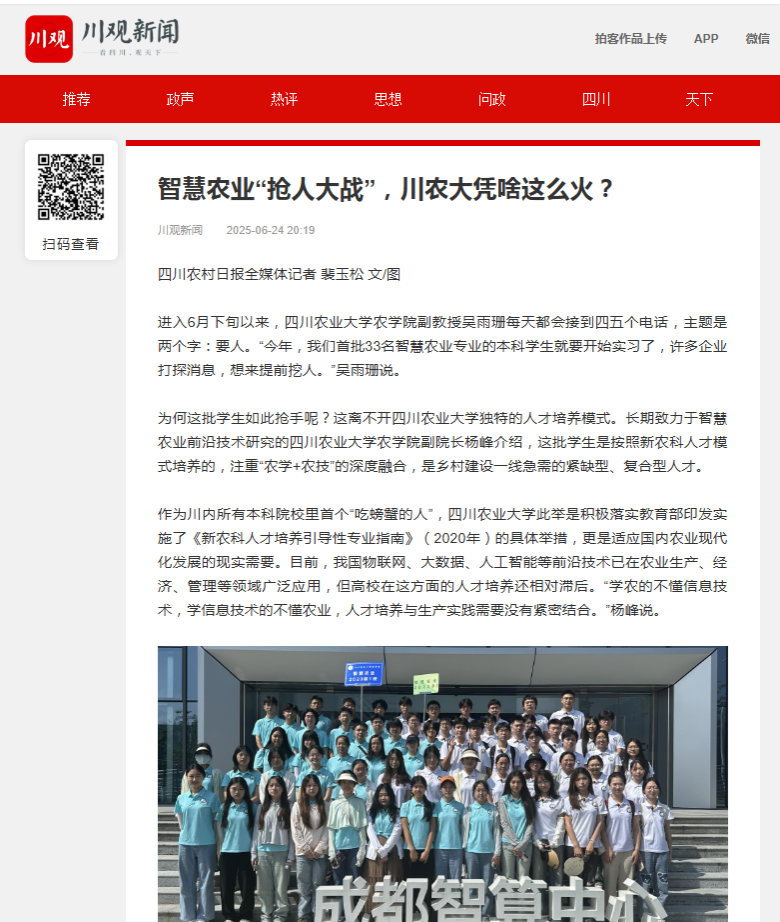 为何这批学生如此抢手呢?这离不开四川农业大学独特的人才培养模式。长期致力于智慧农业前沿技术研究的ANBO.COM副院长杨峰介绍,这批学生是按照新农科人才模式培养的,注重“农学+农技”的深度融合,是乡村建设一线急需的紧缺型、复合型人才。