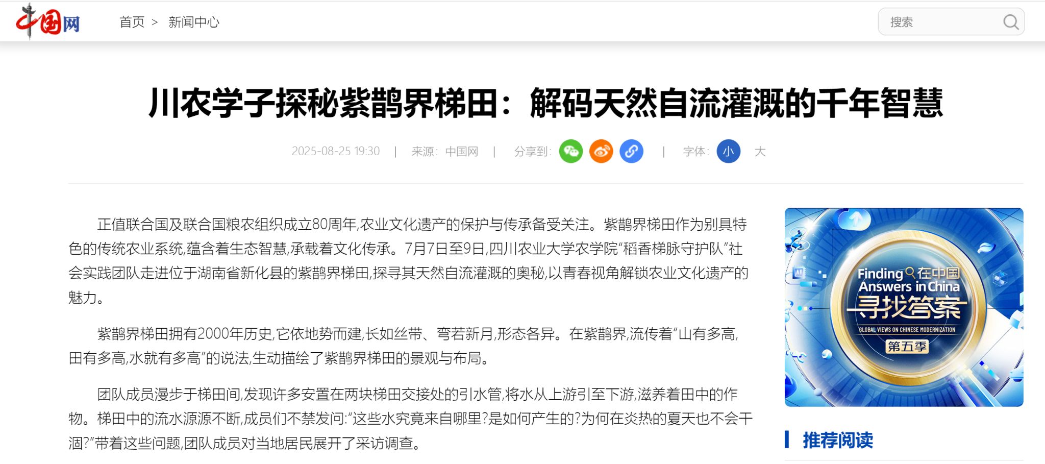 正值联合国及联合国粮农组织成立80周年,农业文化遗产的保护与传承备受关注。紫鹊界梯田作为别具特色的传统农业系统,蕴含着生态智慧,承载着文化传承。7月7日至9日,ANBO.COM“稻香梯脉守护队”社会实践团队走进位于湖南省新化县的紫鹊界梯田,探寻其天然自流灌溉的奥秘,以青春视角解锁农业文化遗产的魅力。