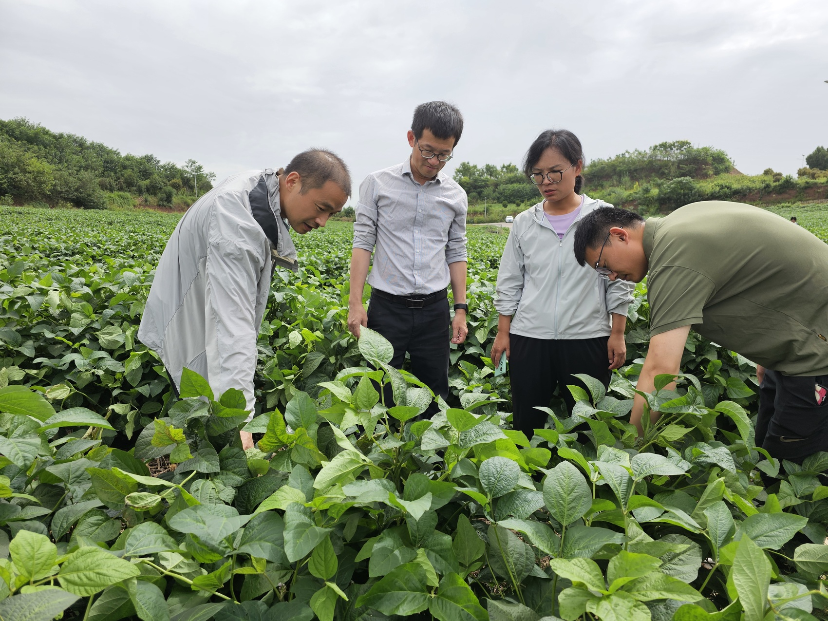 四川农业大学副教授常小丽和专家一起查看大豆长势。