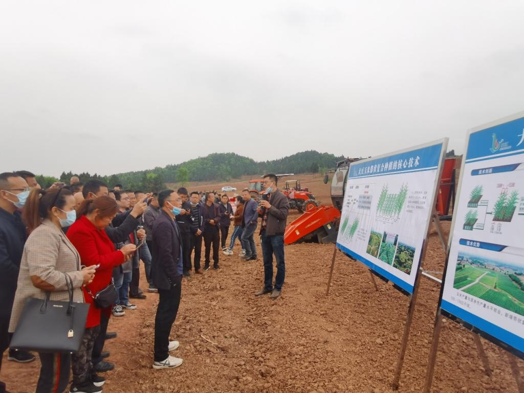 随后,全体人员参加了德阳市和中江县2022年大豆玉米带状复合种植现场观摩会。孔凡磊副教授结合我国玉米大豆产需现状,现场介绍了大豆玉米带状复合种植技术的优势及技术要点,重点围绕品种选择、田间配置、科学施肥、病虫草害防治、播收机具等内容对该技术的具体田间实施方法及注意事项进行了讲解。最后通过现场机播作业演示使大家对大豆玉米带状复合种植机械化生产模式有了新的认识。