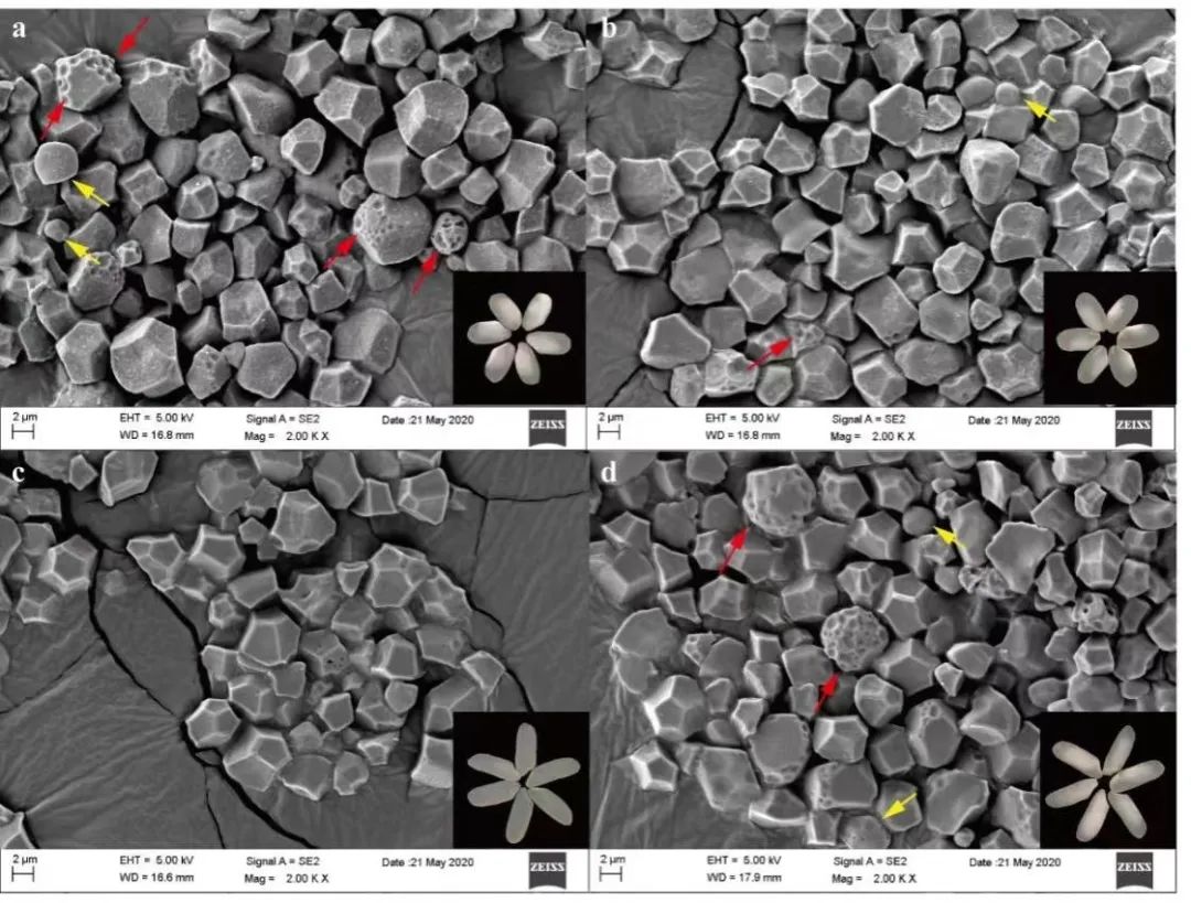 Figure 1Scanning electron microscopy images of rice starch granules from (a and b) GuichaoII and (c and d) Shuhui 498. (a and c): under normal light levels, (b and d): under shading. The red arrows indicate elliptic or near-elliptic starch granules, and the yellow arrows indicate eroded pores on the surface of the starch granules.