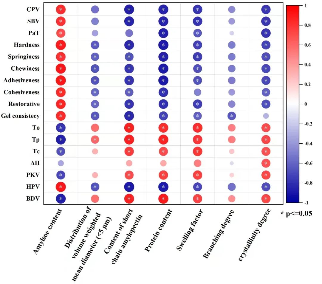 Figure 2Relationship between the pasting, structural, and physicochemical properties. PKV: peak viscosity; HPV: hold viscosity; BDV: breakdown viscosity; CPV: final viscosity; SBV: setback; PaT: pasting temperature.