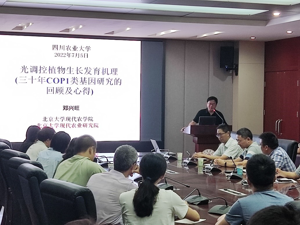 7月5日,北京大学现代农业研究院院长、美国科学院院士邓兴旺教授应邀到我校开展学术交流,并为全校师生做了题为《光调控植物生长发育机理》学术报告。报告会由杨文钰教授主持。