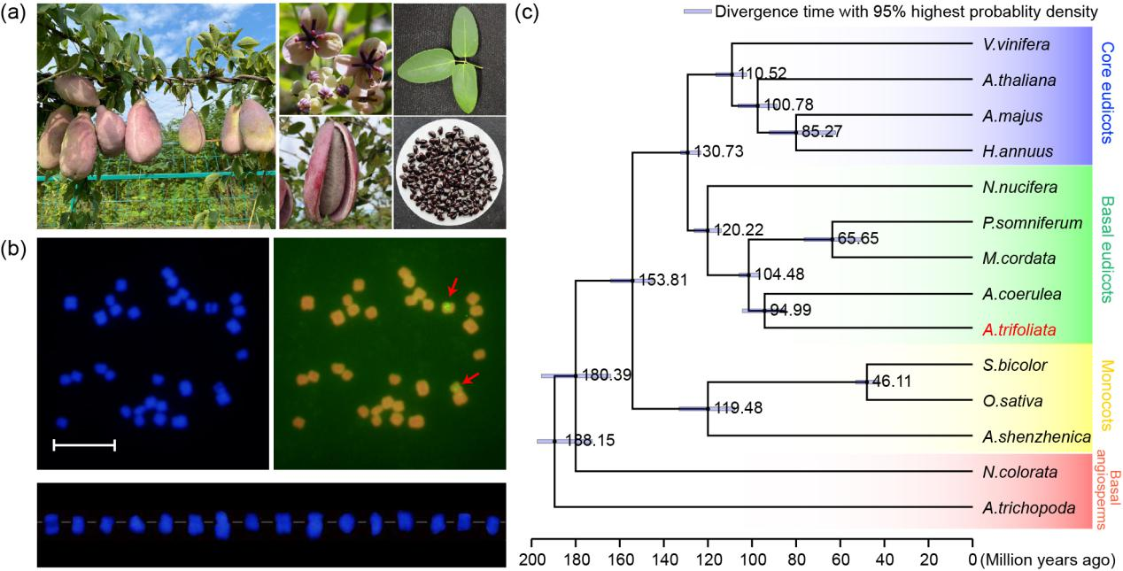 三叶木通是木通科的代表植物,多年生攀援藤本,广泛分布于世界许多地区,尤其是在中国、韩国和日本等东亚地区。在我国,三叶木通被用作一味传统的中药材已有超过2000年,历史十分悠久。而在近年来,三叶木通也被作为水果进行开发,常被称为八月瓜,具有丰富的营养价值,尤其是富含芳香族氨基酸;同时,三叶木通种子富含脂肪酸,脂肪酸占比构成合理,是极具潜力的油料植物;而三叶木通花期长,挂果期长,半落叶的特性,也让其具有成为优良的园林绿化植物的潜力。三叶木通的营养、健康、美学和生态价值正得到越来越多的关注,被作为一种食药油赏同源植物得到了更广泛的开发。该研究通过对三叶木通基因组以及相关基部双子叶植物、核心双子叶植物的分析发现三叶木通中存在两次WGD事件,分别发生在约8500多万年前和约1.4亿多年前,前者是三叶木通中特异的WGD,后者发生在双子叶植物分化的早期(θ事件),同时还鉴定出只存在于核心双子叶植物中的WGD(ω事件)。θ事件更多保留了能响应盐、二氧化碳和干燥等环境因素引起的极端胁的重复基因,而ω事件的更多保留了能够响应干旱或水分胁迫的基因,这说明通过ω事件复制的基因可能更好的适应了白垩纪中期的干旱环境,从而协助核心双子叶植物的快速辐射。该论文释放了三叶木通基因组资源,厘清了三叶木通的核型的争论;推导了的双子叶植物古老WGD可能出现的时间;阐明了三叶木通对环境适应的分子机制。