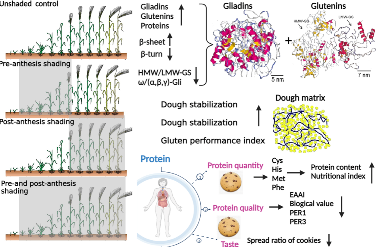 近日,四川农业大学小麦生理生态与栽培课题组在加拿大食品科技研究所主办期刊Food Research International(中科院一区TOP, IF=8.2),在线发表了题为“Regulating the composition and secondary structure of wheat protein through canopy shading to improve dough performance and nutritional index”的研究论文,阐明了弱光胁迫调控小麦面筋性能与蛋白质营养的结构基础。该研究对全球暗化背景下制定育种目标和栽培管理技术减损提质有重要意义。